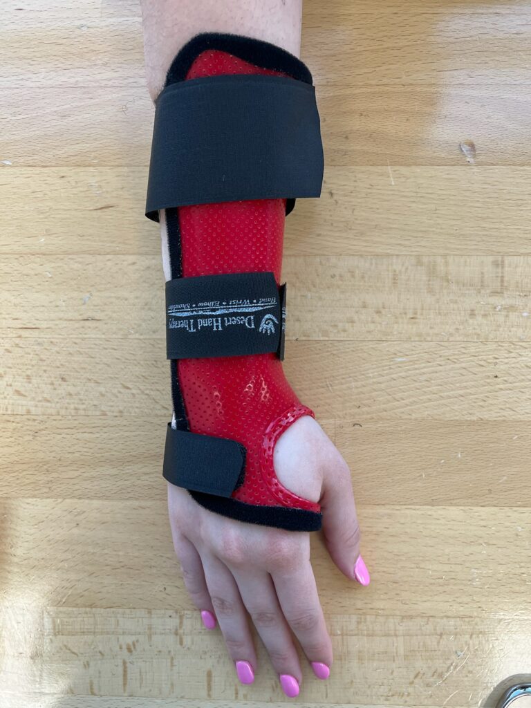 Occupational therapy, especially at Desert Hand and Physical Therapy, can help conservatively manage carpal tunnel symptoms in many ways! We help with an exercise routine that can allow the nerve more space to breathe and glide to perform its functions more easily. We also make custom orthoses that have been proven by research to reduce inflammation on the nerve over night! Did you know nerves are most active over night? Our custom splints (pictured below) provide an opportunity for the nerve to remain neutral and safe over night and improve conduction. Also, therapy helps with some activity modifications that help you continue to do all your activities with reduced pain and symptoms. Sometimes, a small change in positioning can create a big change for your pain!