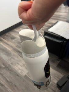 Throughout my daily life, I am constantly adapting and modifying daily activities that I find myself providing patient education on. Most impactfully, I consider prevention of future injuries. One common diagnosis seen in our clinics is carpometcarpal osteoarthritis. This requires a significant amount of education on proper positioning, proper pinching mechanics, and activity modifications to manage pain and prevent injury or further progression of disease process. In my own life, I remind myself of “O to C” pinching when I am using tweezers on my eyebrows, putting on mascara, or when opening zip lock bags. I also have adopted basic joint protection principles that I teach patients as well to load the larger joints, stir with the shoulder, or keep the thumb from touching the palm with all functional use. I also remind myself to use larger joints when I carry items to save and protect my thumb and finger joints, especially carrying my water bottles. I have even figured out what water bottles are the most ergonomic, such as one with a handle for fingers to carry rather than a handle that requires you to make a full fist with your thumb (see photo below). Another common diagnosis we see is carpal tunnel. One of the main contributing factors and educational points for carpal tunnel is sleeping in a position with your wrist flexed. I have actively been more aware of my wrist position when I am sleeping to prevent compression of the median nerve at night because I do not want to end up wearing wrist neutral splints at night.
